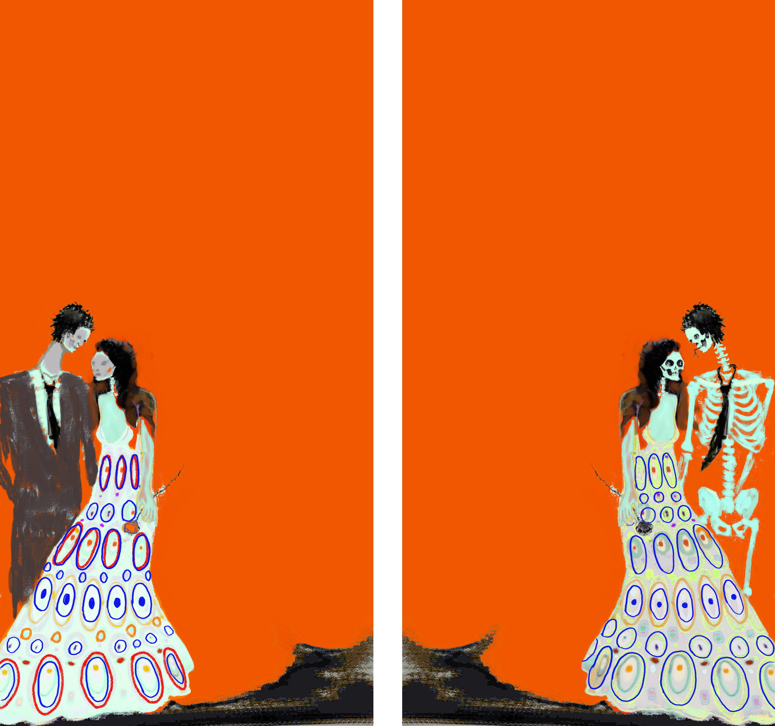 Nicholaas Chiao's exceptional metaphorical painting of a man and woman symbolizes eternal love and a cycle of life. The painting is characterized by a monochromatic orange color scheme, accented with the whites of wedding dresses and the rhythms of ultramarine blue decor. The composition is unusual and dynamic, with the figures occupying the edges and the horizontal middle of the canvas. The artwork evokes the styles of Gustav Klimt, particularly 'The Kiss,' and Edvard Munch, particularly 'The Dance of Life.' (Edvard Munch's Influence on 20th Century Art, 2025) On the left side of the diptych, we see a young, handsome couple of newlyweds, and on the right side, perhaps the same couple years later, as aged, near-walking-dead skeletons still mutually affected by love and staying together. The catalyst for the idea to paint 'The Wedding of Skeletons' was a piece by Spanish artist Oscar Nin, whose work depicting a wedding in a dark, horror-filled style on a black background intrigued Nicholaas Chiao. This painting, 'Together in Marriage and Plans of Life and Death,' symbolizes eternal love that endures from youth to old age. Nicholaas Chiao explores themes of the cyclical nature of existence and the notion of rebirth after life has ended.